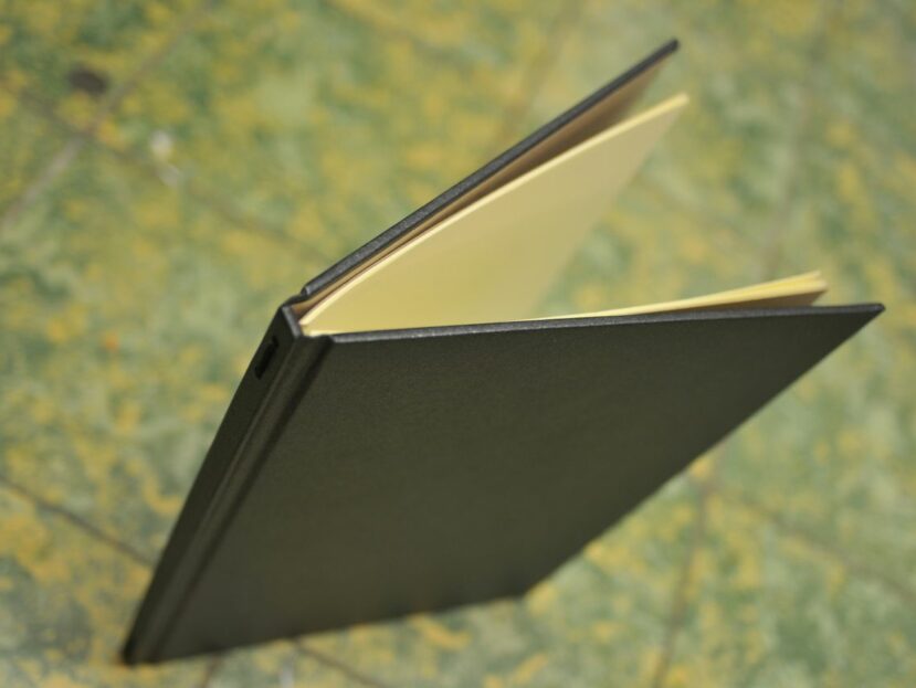Prototype pour un menu d’hôtel, reliure par tubulaire élastique. Papier extérieur noir argenté : Fedrigoni Siorio Pearl Black. Papier des gardes couleurs : Fedrigoni Saville row tweed. Papier intérieur : Fabriano Palatina Avorio.