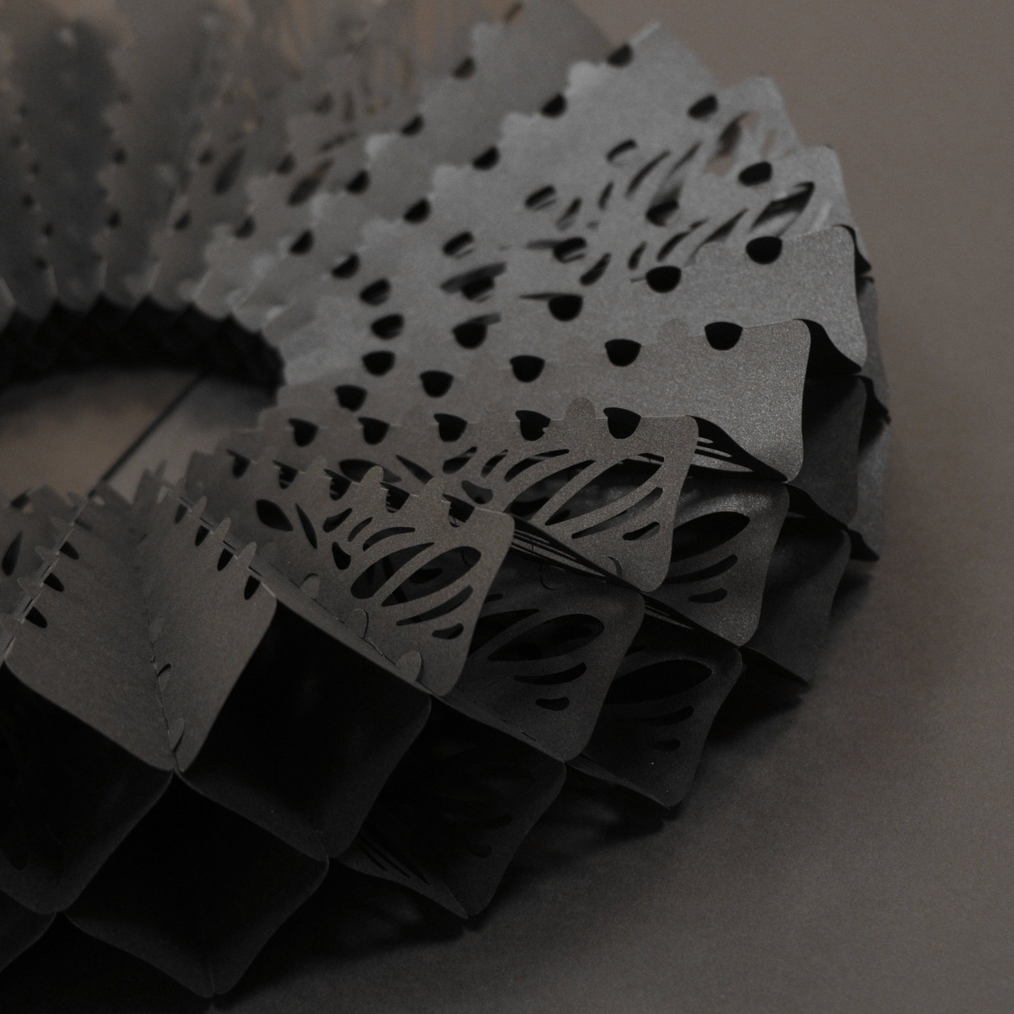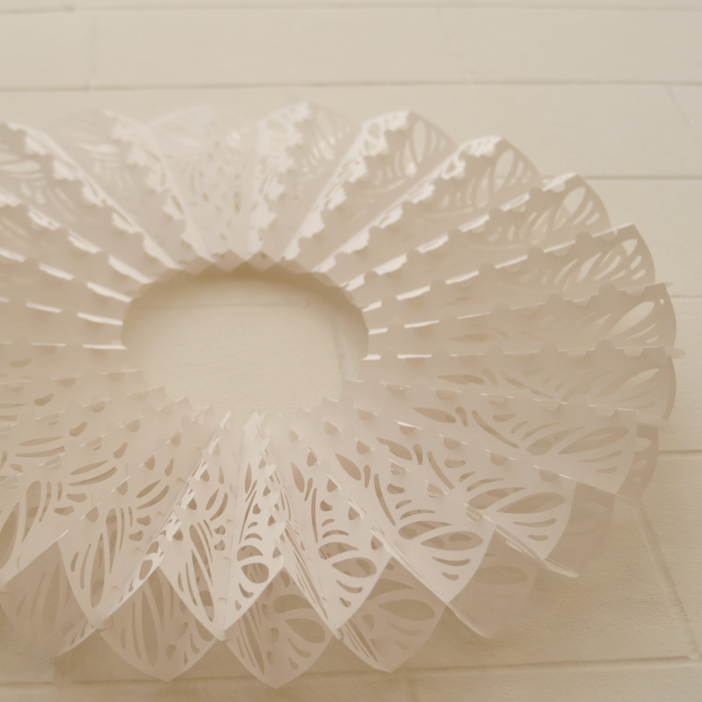 ...« certaines pièces aux allures organiques se déploient telles des parures de papier, des coiffes rituelles ou des casques de samouraïs. Elles sont composées de bandelettes aux couleurs tantôt contrastées pour révéler les secrets de l’assemblage, tantôt monochromes et laissent alors apparaître des ensembles richement ciselés. La quantité délirante de clés et crochets qui fusionnent pour structurer ces délicates formations laisse entrevoir »....