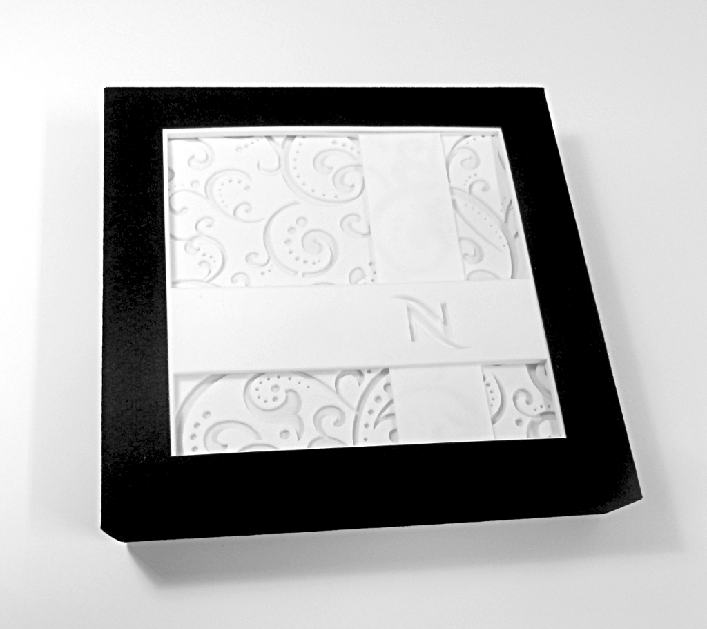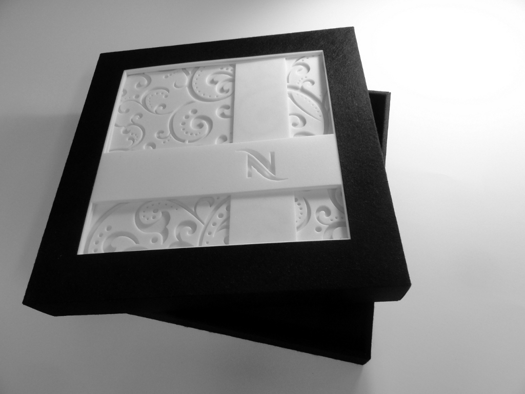 Dessin du modèle et conception (sauf mousse blanche, volutes et motifs : ACT*) montage de 140 Boîtes pour Nespresso via Impressor Ariane et ACT*, découpe laser pour la base et le couvercle dans du papier Softy Black, mousse blanche en découpe au jet d’eau à haute pression.