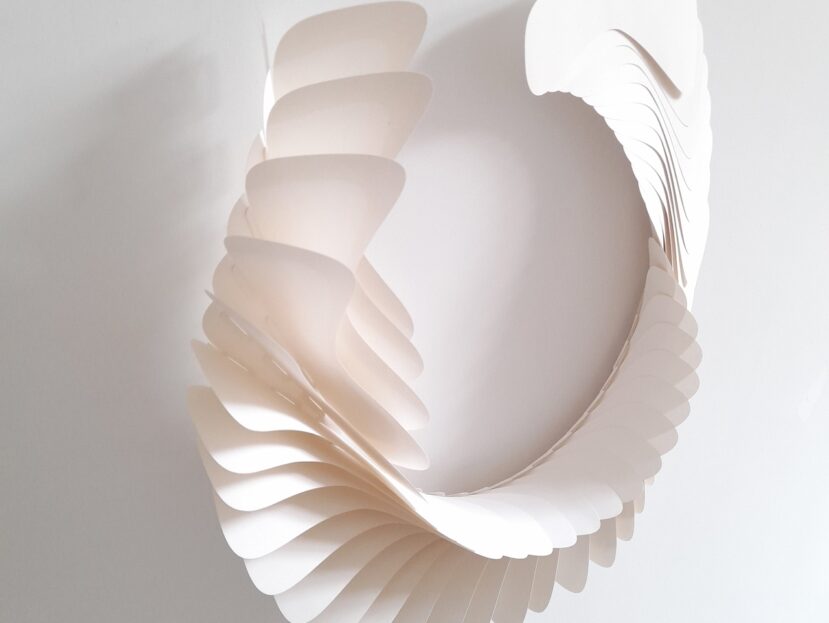 Entre livre et installation, il a pris différentes formes, celle-ci sera la définitive… Au départ, je comptais créer une œuvre tout en longueur, telle qu’elle a été exposée au Musée Royal de Mariemont l’été 2024… En fin de compte, ce sera l’infini d’un cercle, un livre blanc infini aux pages courbées et asymétriques se rapprochant d’un vase, d’un contenant à …