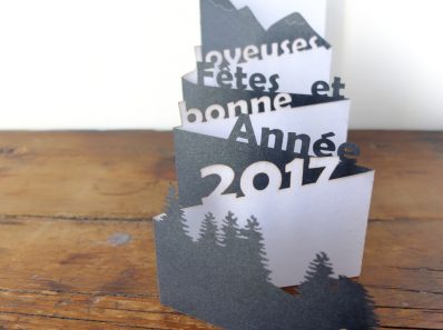 Carte de vœux animée pour www.corse-romane.eu site internet répertoriant les chapelles romane situé sur l’Île de Beauté. Carte ne nécessitant pas de colle, tient par enchâssement de papiers. Dessin d’après photos. Plus d’infos sur la chapelle qui a servie de modèle pour cette carte : San Giovanni Battista dans le village de Poggio di Tallone