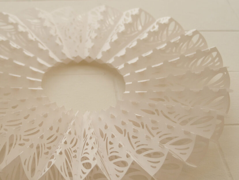Afin d’aller plus loin dans l’inspiration des fraises de la Renaissance, j’ai cherché à augmenter le nombre de rangs pour épaissir la collerette et avoir plus de volume. En réduisant le nombre de plis par papier et en changeant la séquence d’accrochage, je suis arrivé à l’impression de trois rangs, tout en gardant le même type d’accrochage « Krucpapero ».