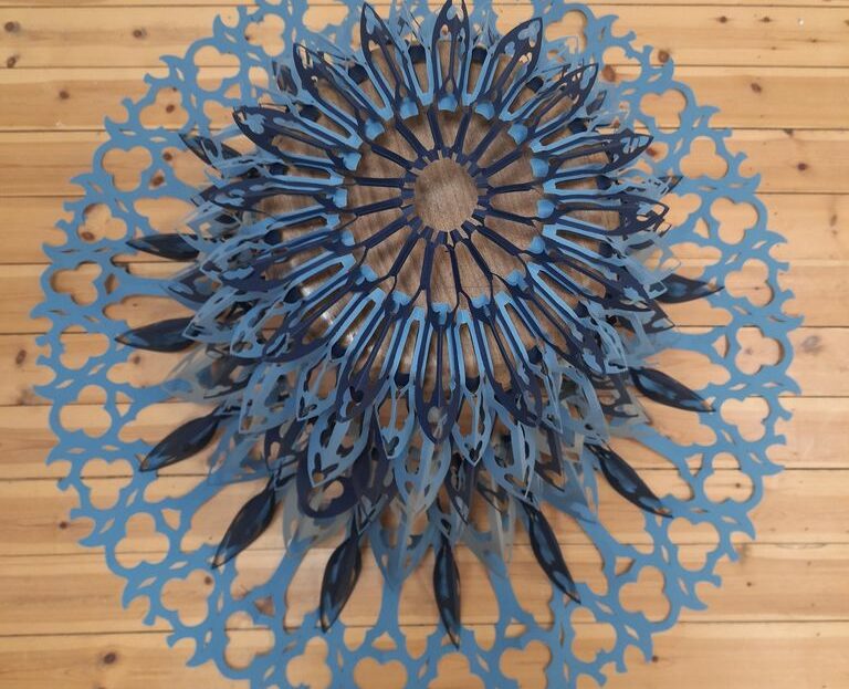 J’ai réalisé cette œuvre en explorant les thèmes de la frontière, du patrimoine commun entre la Belgique, la France et l’Art nouveau comme langage partagé. Ce qui m’a inspiré, ce sont les guéridons de cette époque, ainsi que les petits abat-jour en porcelaine translucide, suspendus au-dessus des tables de cuisine, comme on en trouvait dans les maisons. Ces lampes étaient …