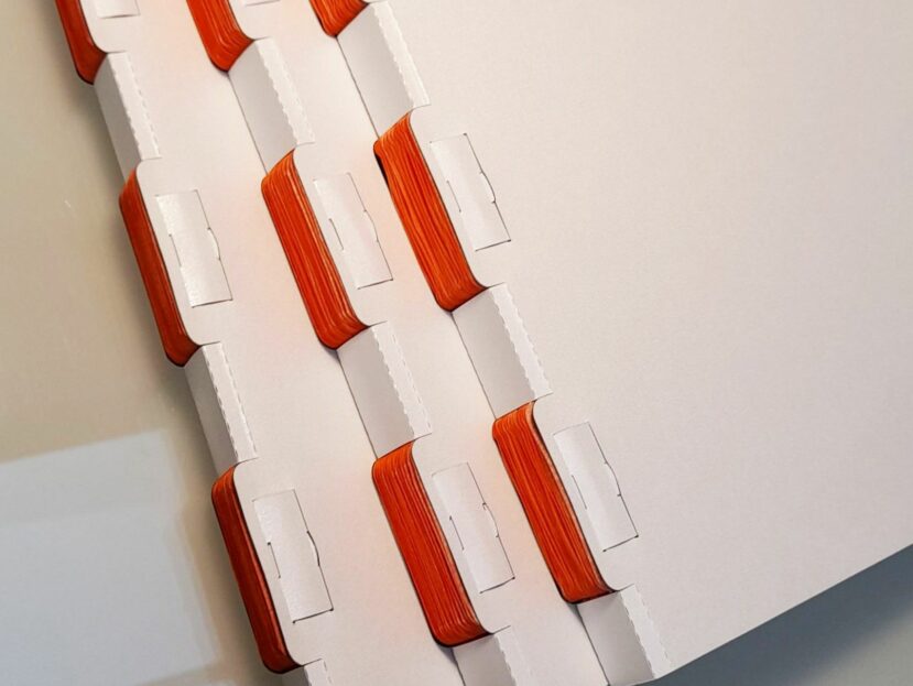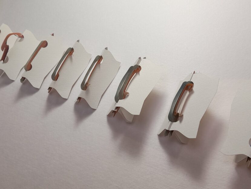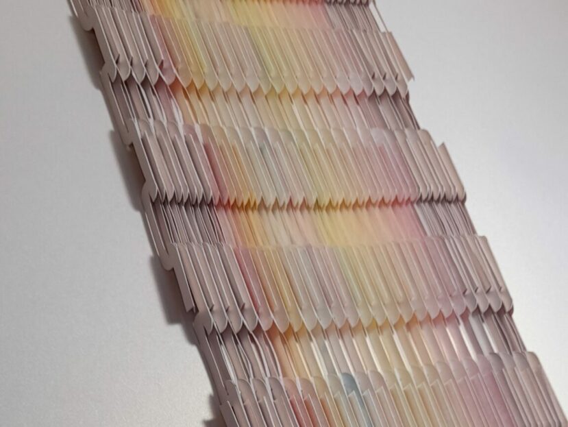 Chaque languette de papier, dans une minutieuse gradation, est réduite de 1% par rapport à la précédente, formant ainsi une séquence de 100 languettes, la plus petite ayant la moitié de la taille de la plus grande. Le papier, d’une texture mate et granuleuse, revêt une teinte sophistiquée, un aubergine profond et riche difficilement photographiable.
