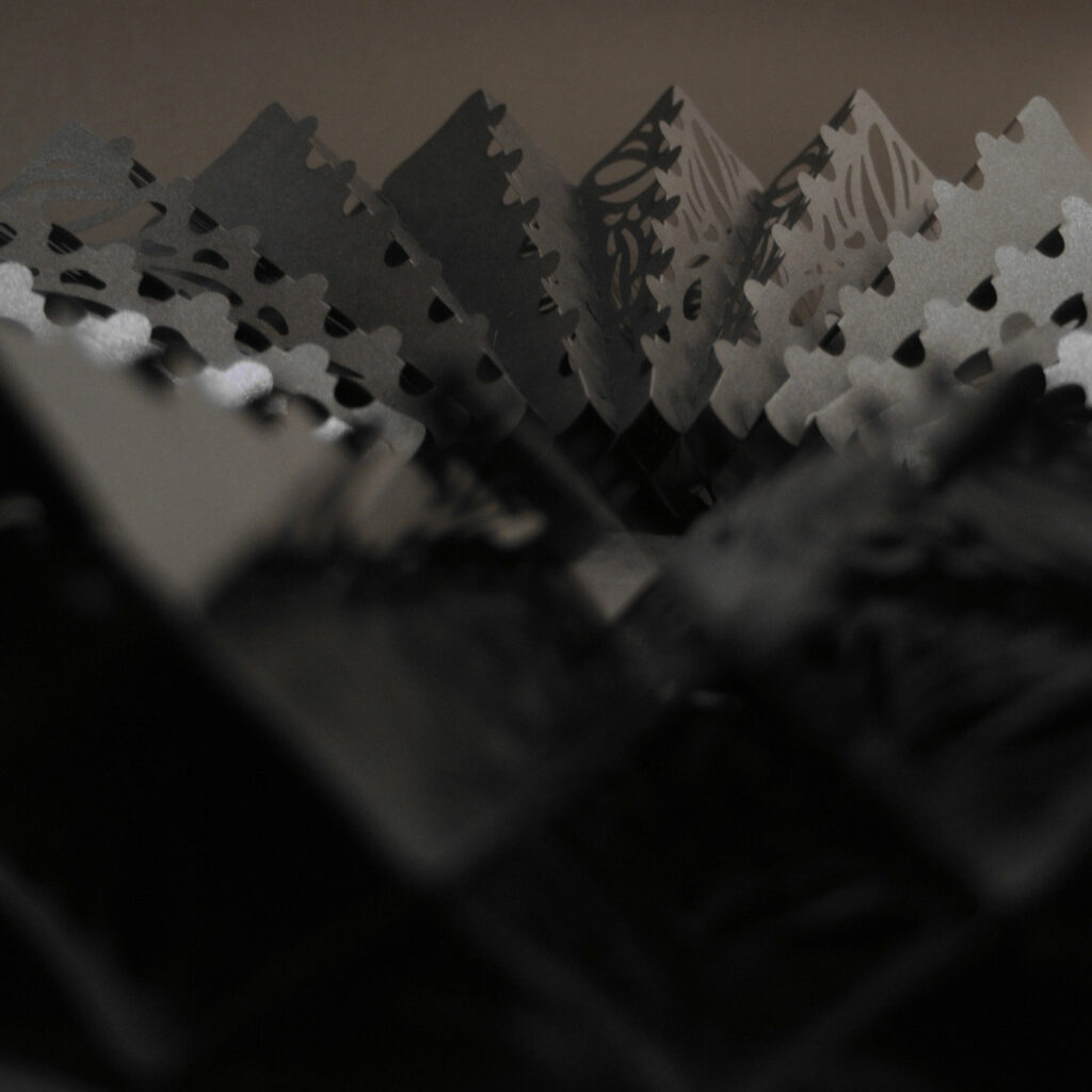 Afin d’aller plus loin dans l’inspiration des fraises de la Renaissance, j’ai cherché à augmenter le nombre de rangs pour épaissir la collerette et avoir plus de volume. En réduisant le nombre de plis par papier et en changeant la séquence d’accrochage, je suis arrivé à l’impression de trois rangs, tout en gardant le même type d’accrochage « Krucpapero ».