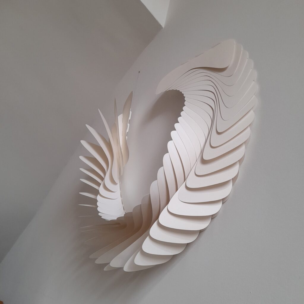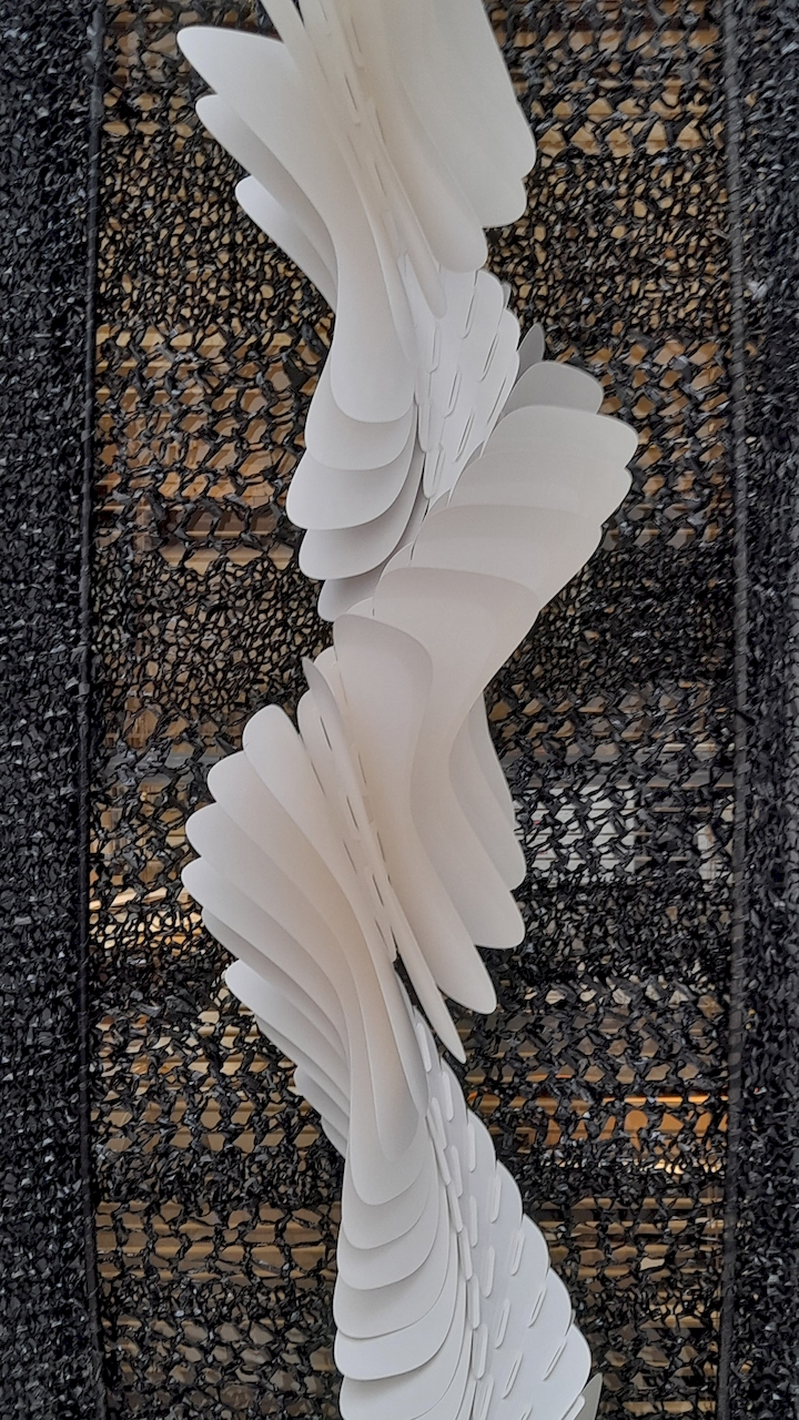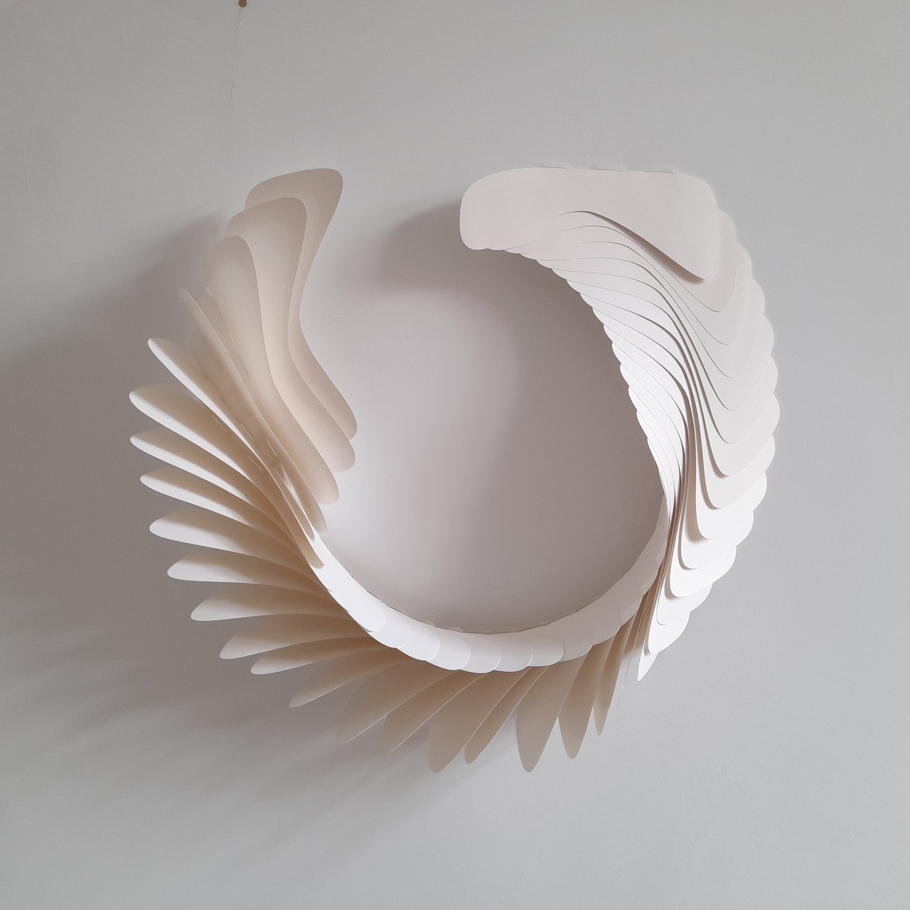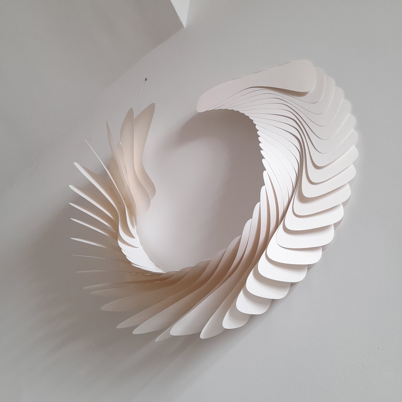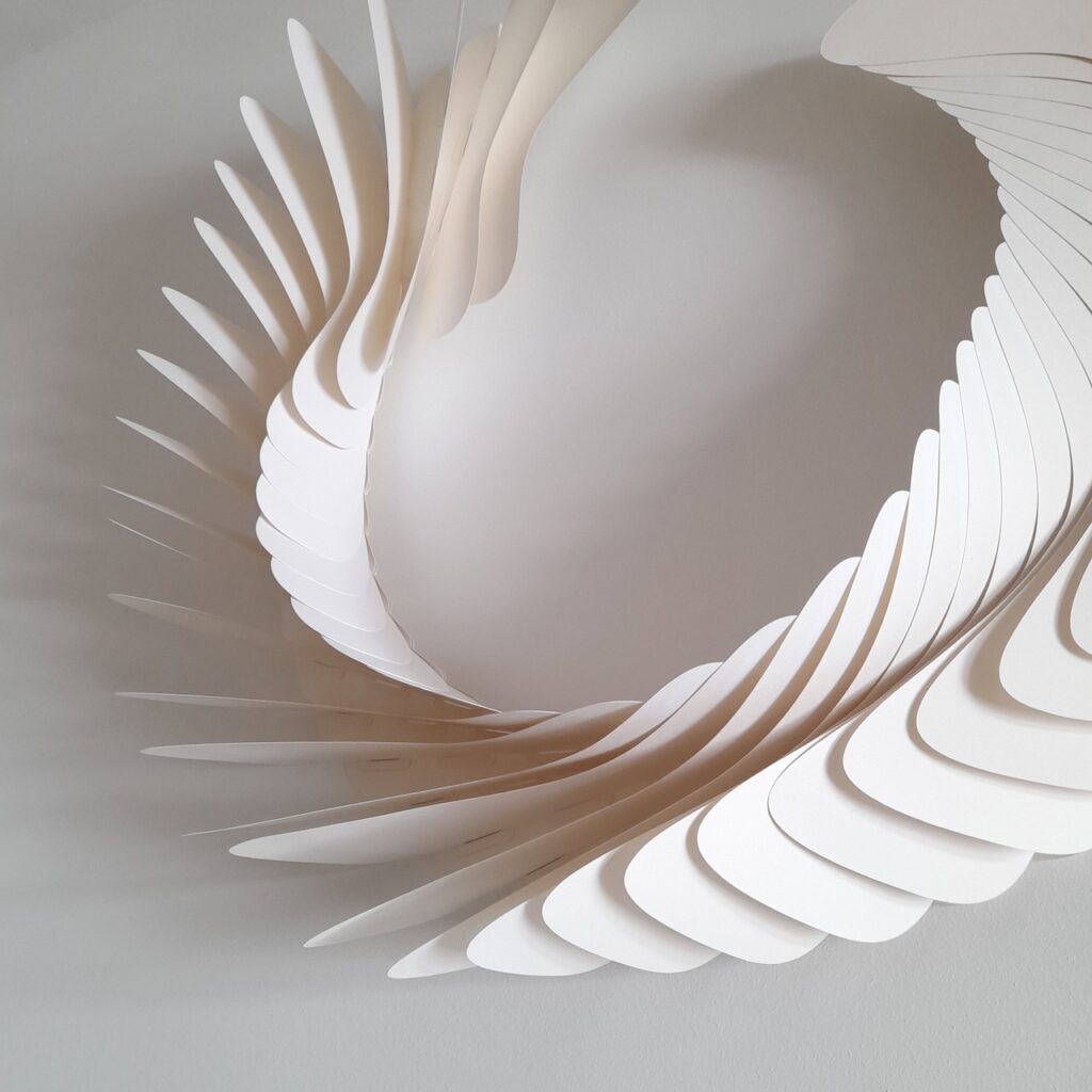 Trois quarts de cercle 36/48èmes. Cette œuvre se déploie en deux mouvements possible. En cercle, elle s’élance tel une hélice légère, une spirale de papier qui semble vouloir défier la gravité. Suspendue, elle se transforme en une tornade aérienne, une danse de feuilles qui captent la lumière créant un mouvement vertical tourbillonnant.