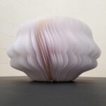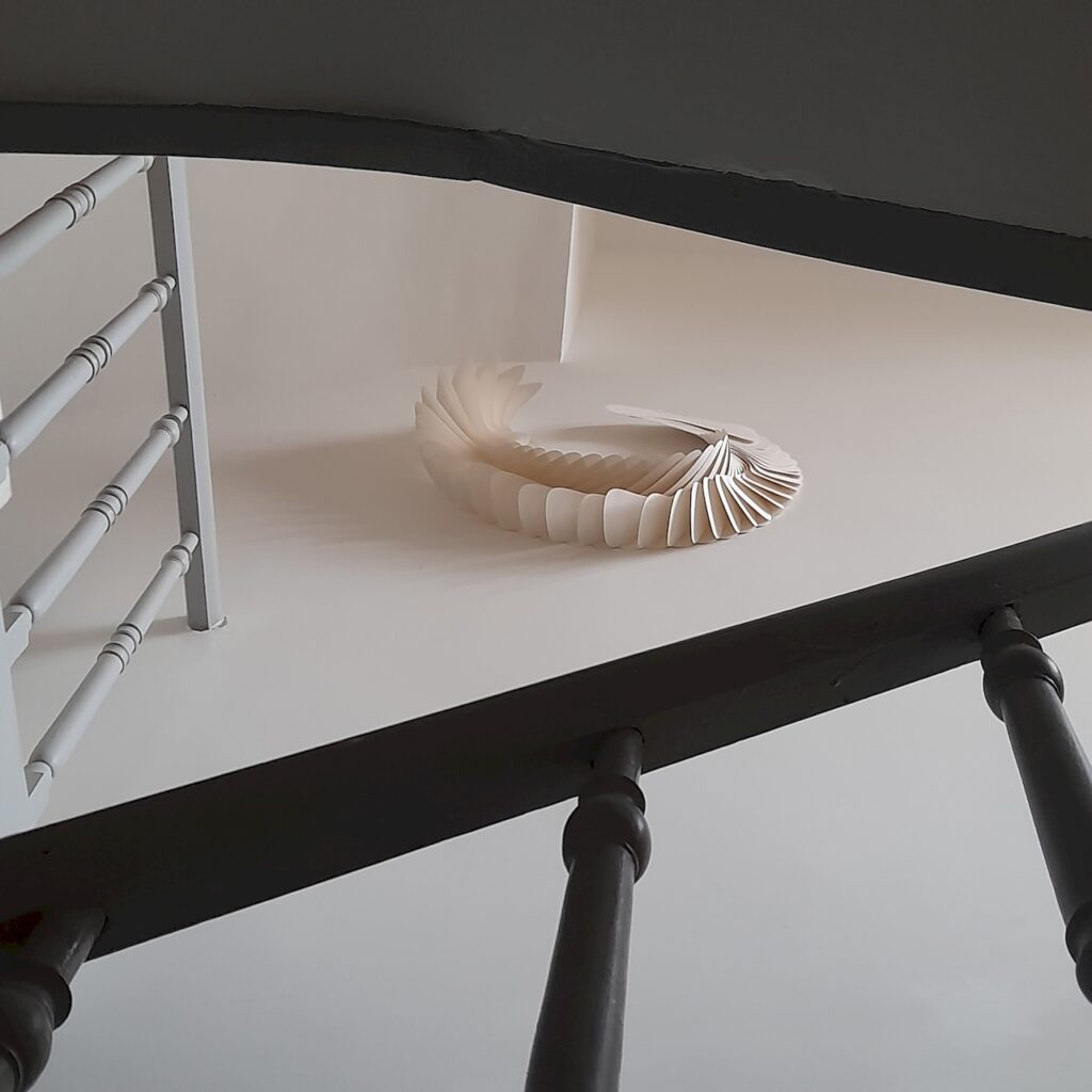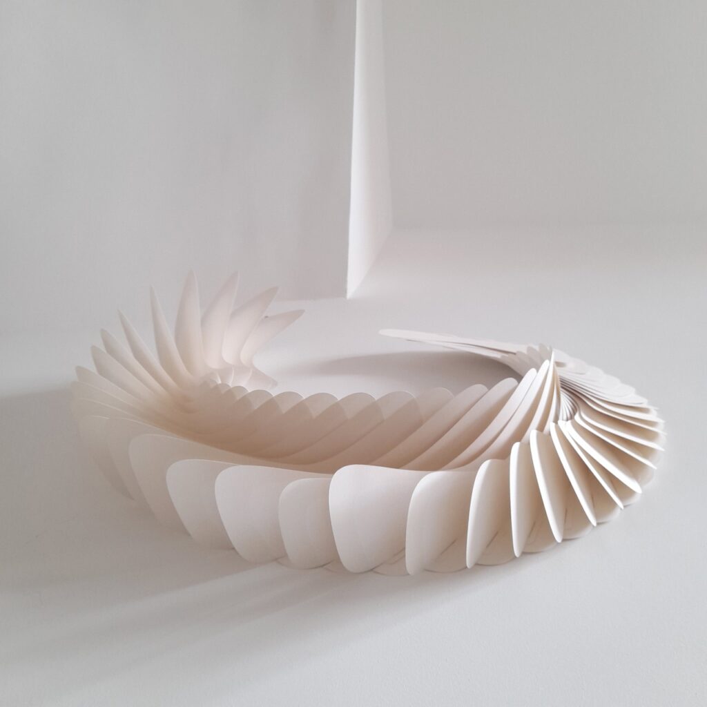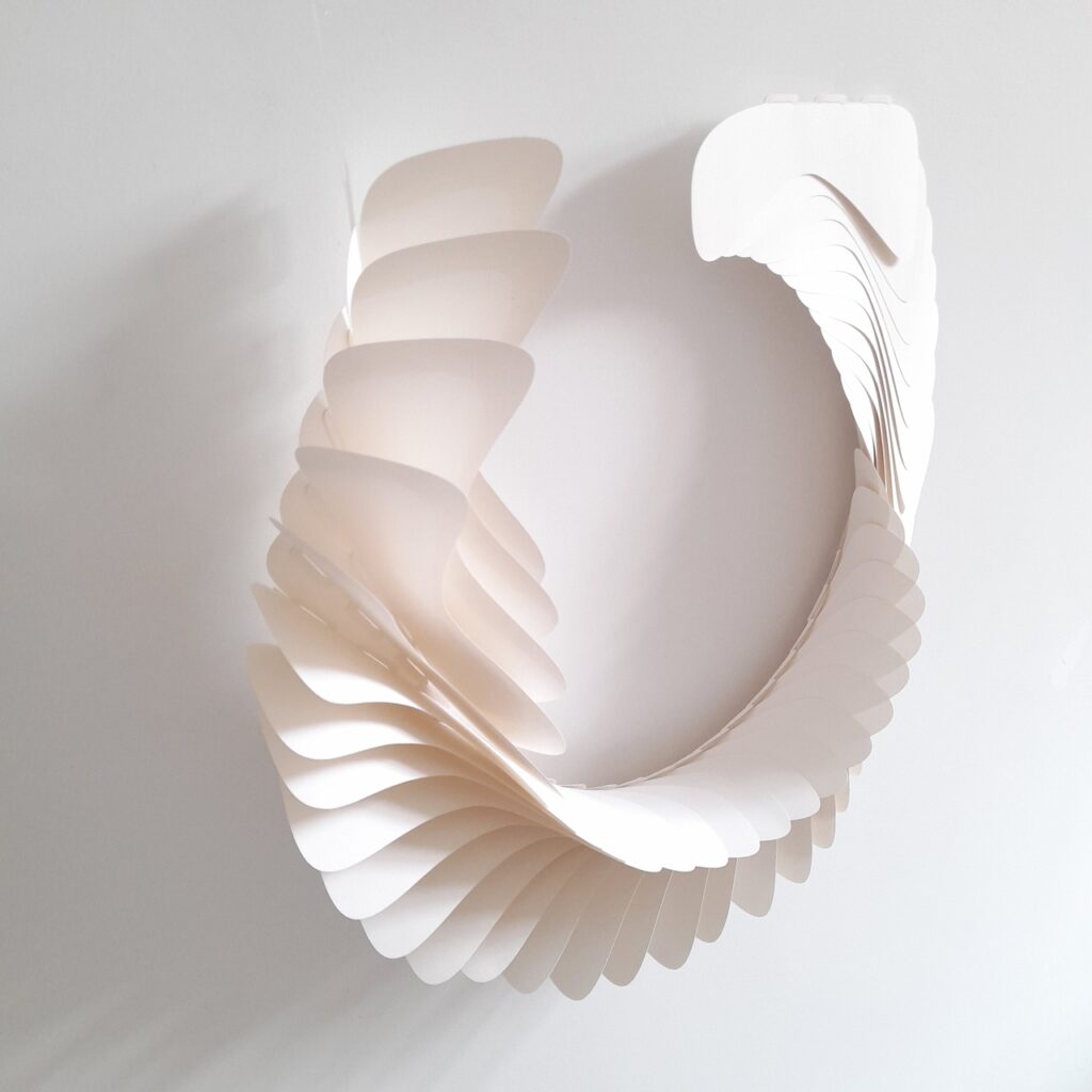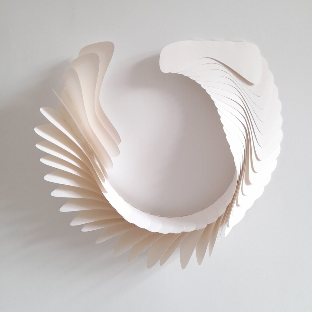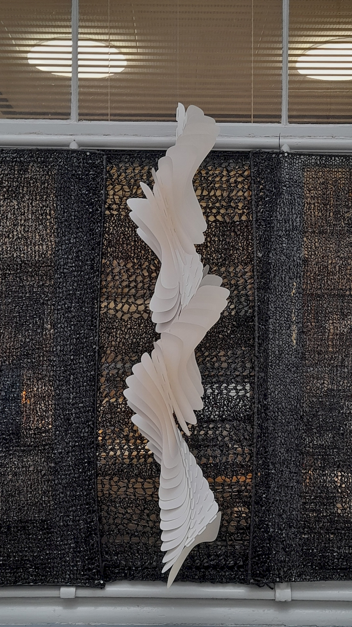 Trois quarts de cercle 36/48èmes. Cette œuvre se déploie en deux mouvements possible. En cercle, elle s’élance tel une hélice légère, une spirale de papier qui semble vouloir défier la gravité. Suspendue, elle se transforme en une tornade aérienne, une danse de feuilles qui captent la lumière créant un mouvement vertical tourbillonnant.