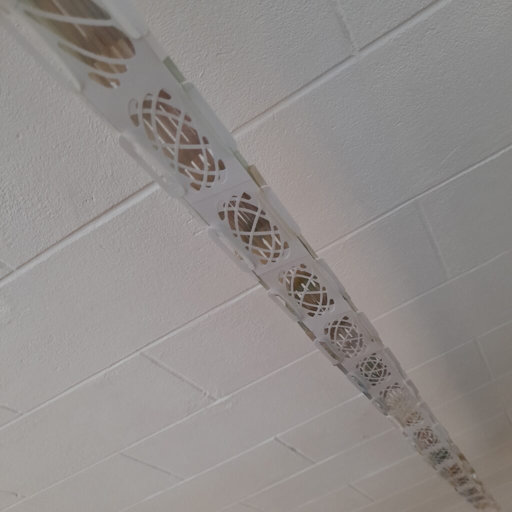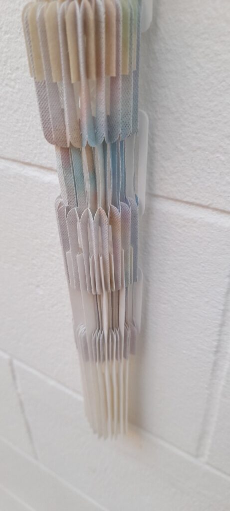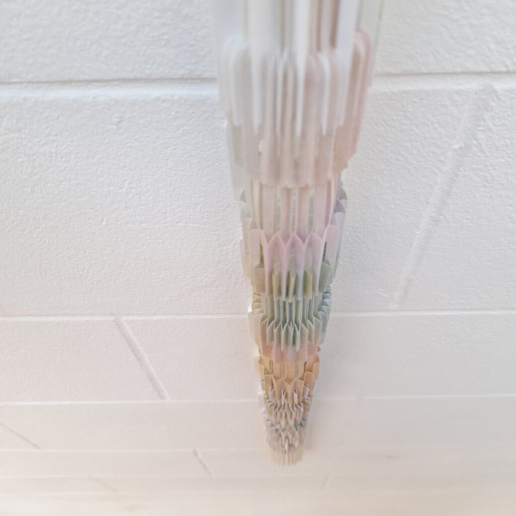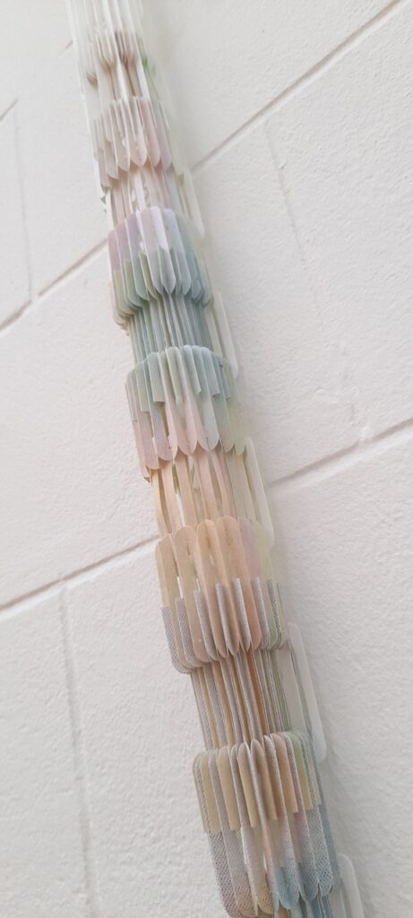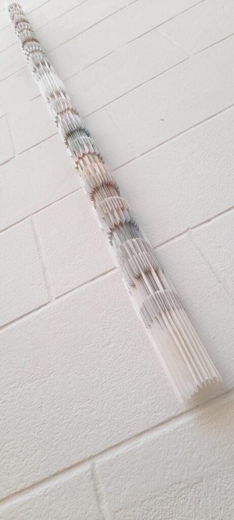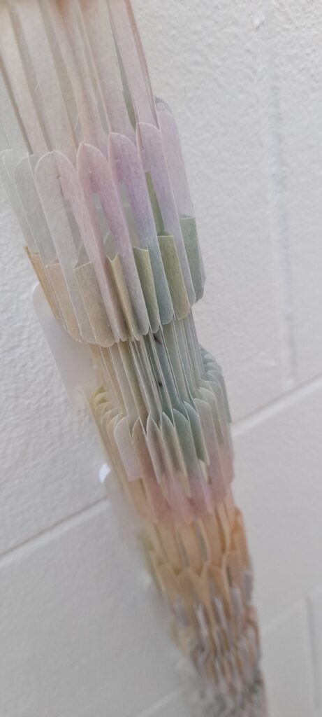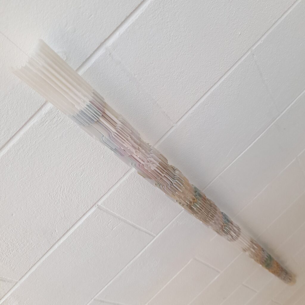 Cette œuvre, toute en longueur, est composée de papiers aux textures intrigantes et uniques. Réalisée par impression jet d’encre et montage par crochets de papier ‘Paperoko’. Un tout grand merci à Wibni Papers ( @wibnipapers ) pour les échantillons de test. L’œuvre se compose de 14 éléments de structure et de 99 languettes de papier, imprimées et découpées numériquement, puis assemblées avec soin.