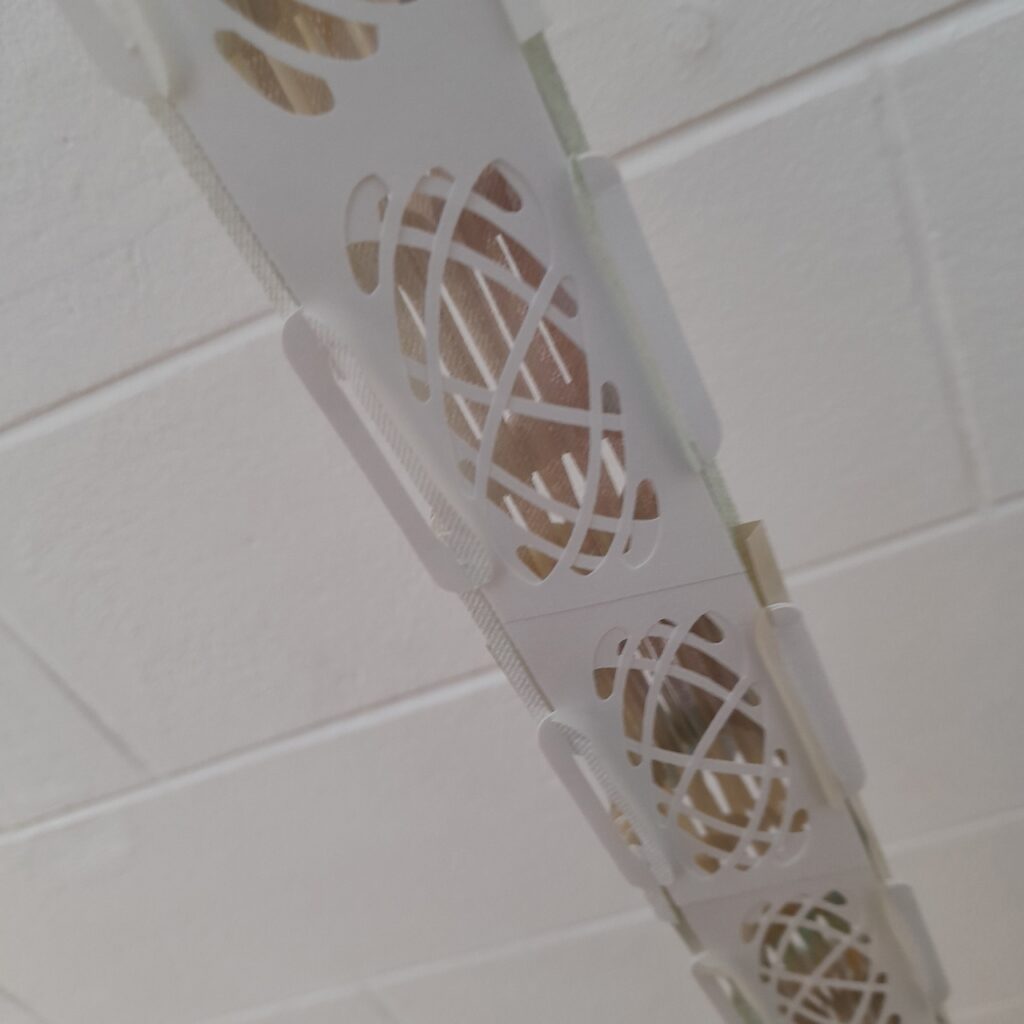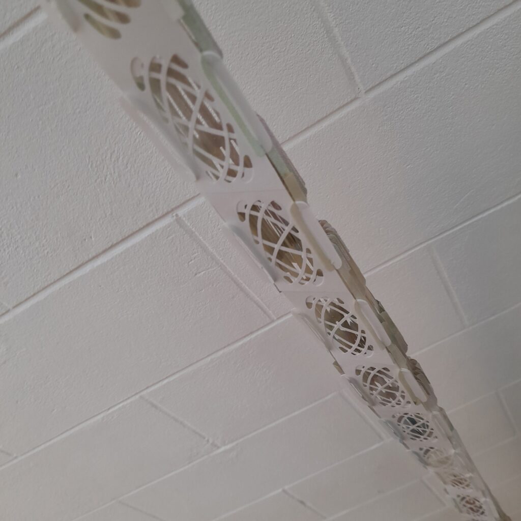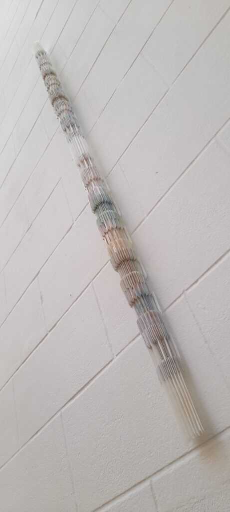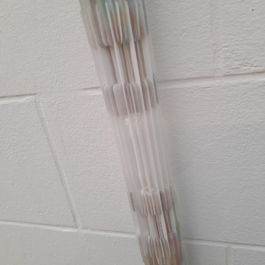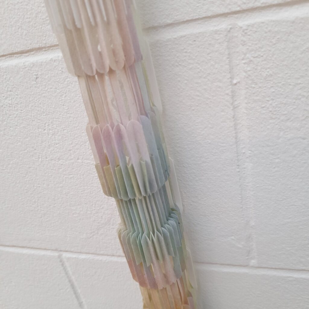 Cette œuvre, toute en longueur, est composée de papiers aux textures intrigantes et uniques. Réalisée par impression jet d’encre et montage par crochets de papier ‘Paperoko’. Un tout grand merci à Wibni Papers ( @wibnipapers ) pour les échantillons de test. L’œuvre se compose de 14 éléments de structure et de 99 languettes de papier, imprimées et découpées numériquement, puis assemblées avec soin.