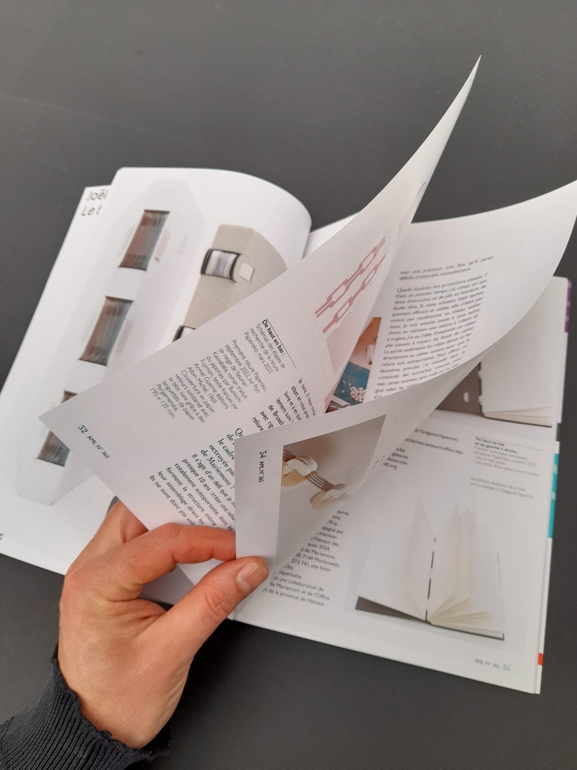 En 2023, Grégoire Vigneron est lauréat de la « Bourse de recherche en création et design du livre » qui lui permet d’aboutir une recherche prometteuse autour de la reliure par crochets et clés en papier. Fruits de réflexions et d’essais techniques de plus de 10 ans, les reliures Paperoko et Paperoŝlo mises au point par le relieur sont innovantes et totalement autoportantes.