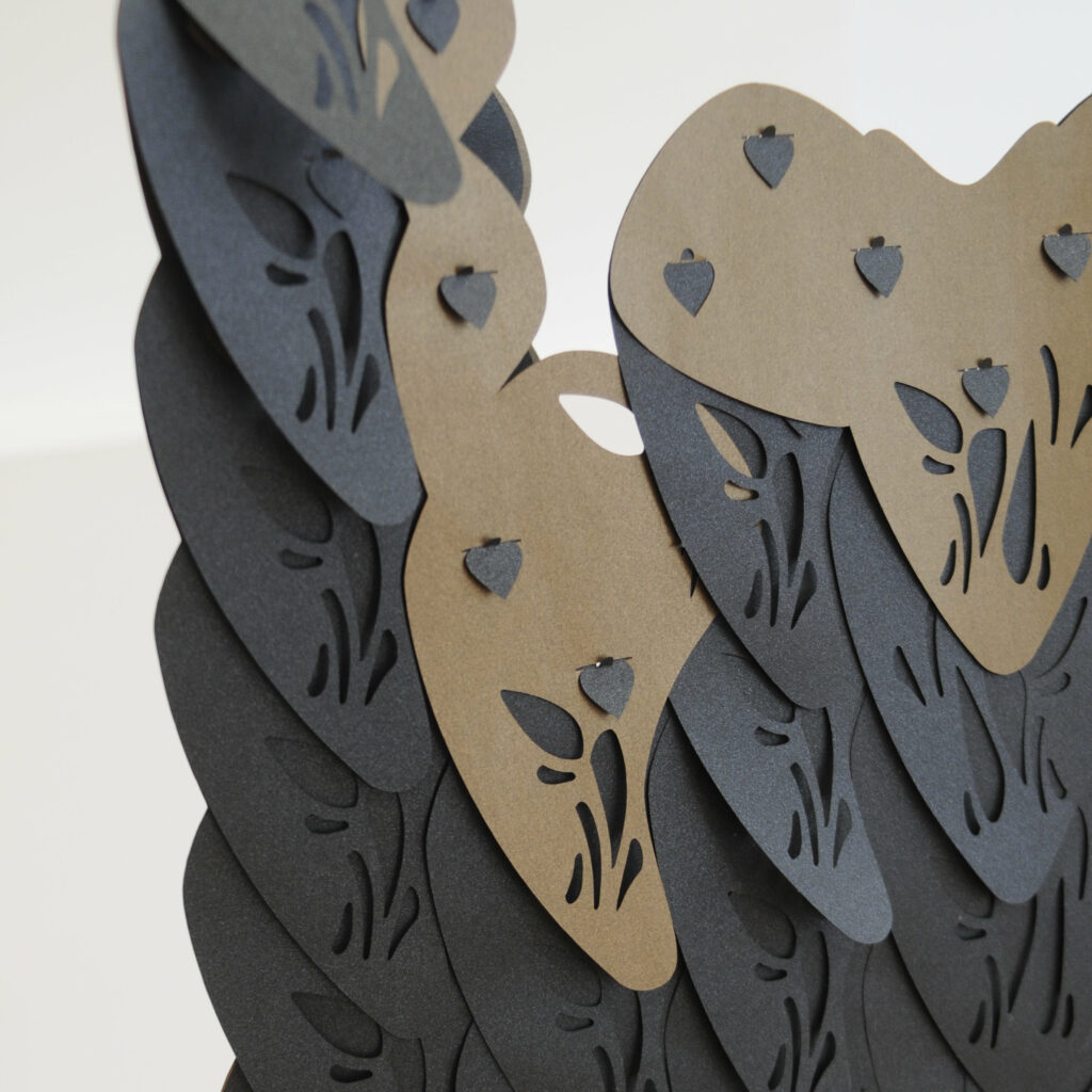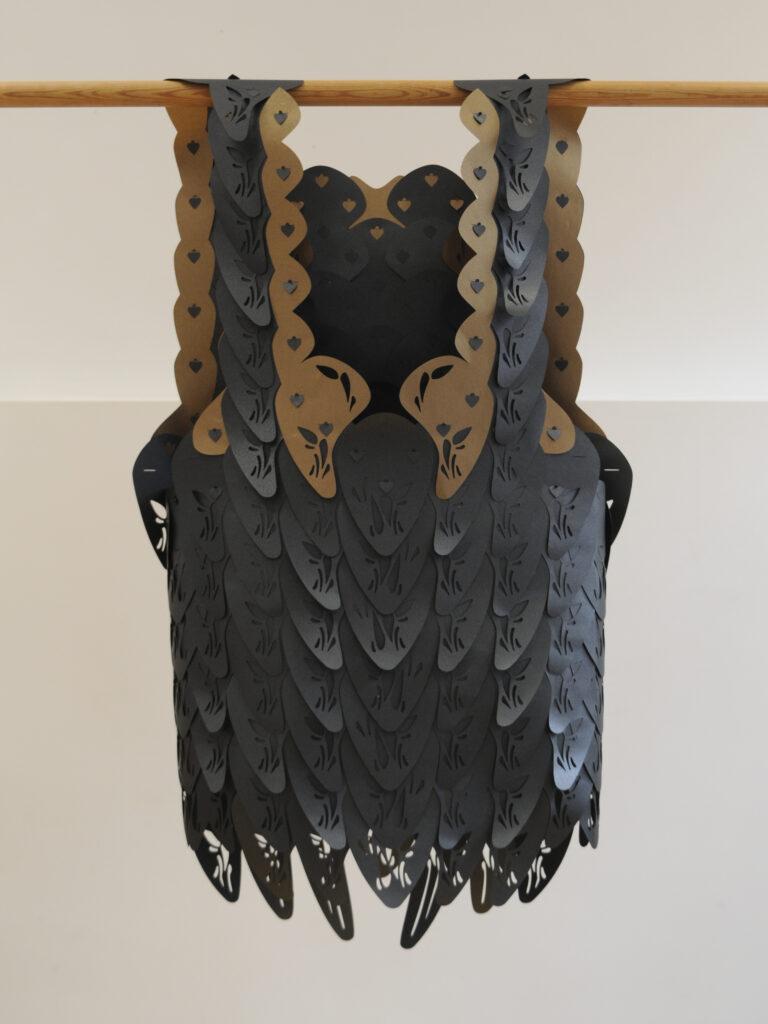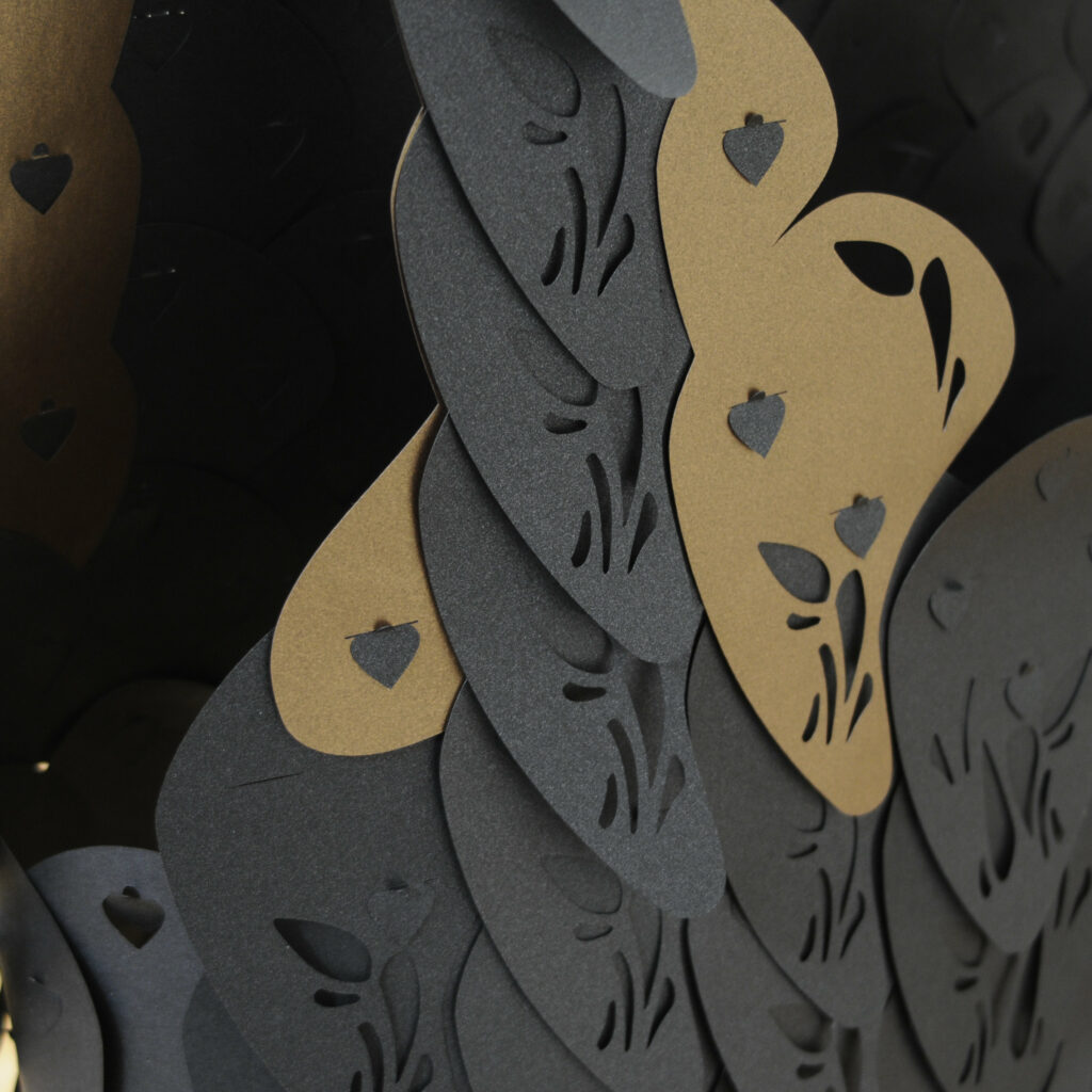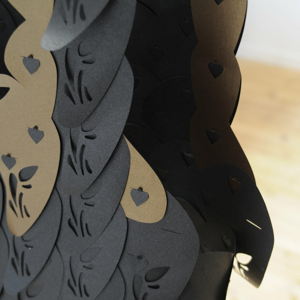 D’inspiration « Art Deco » c’est une robe 100 % papier, 0 % de quoi que ce soit d’autre ! Pas de colle, ni de fil : absolument que du papier muni d’entailles. 178 pièces assemblées, chacune par un minimum de 4 accroches en forme de cœur « Korkarto ».