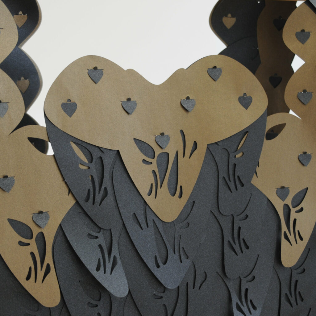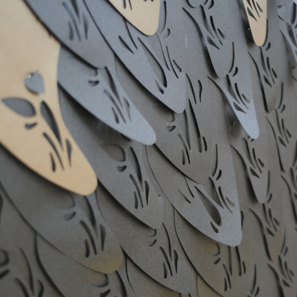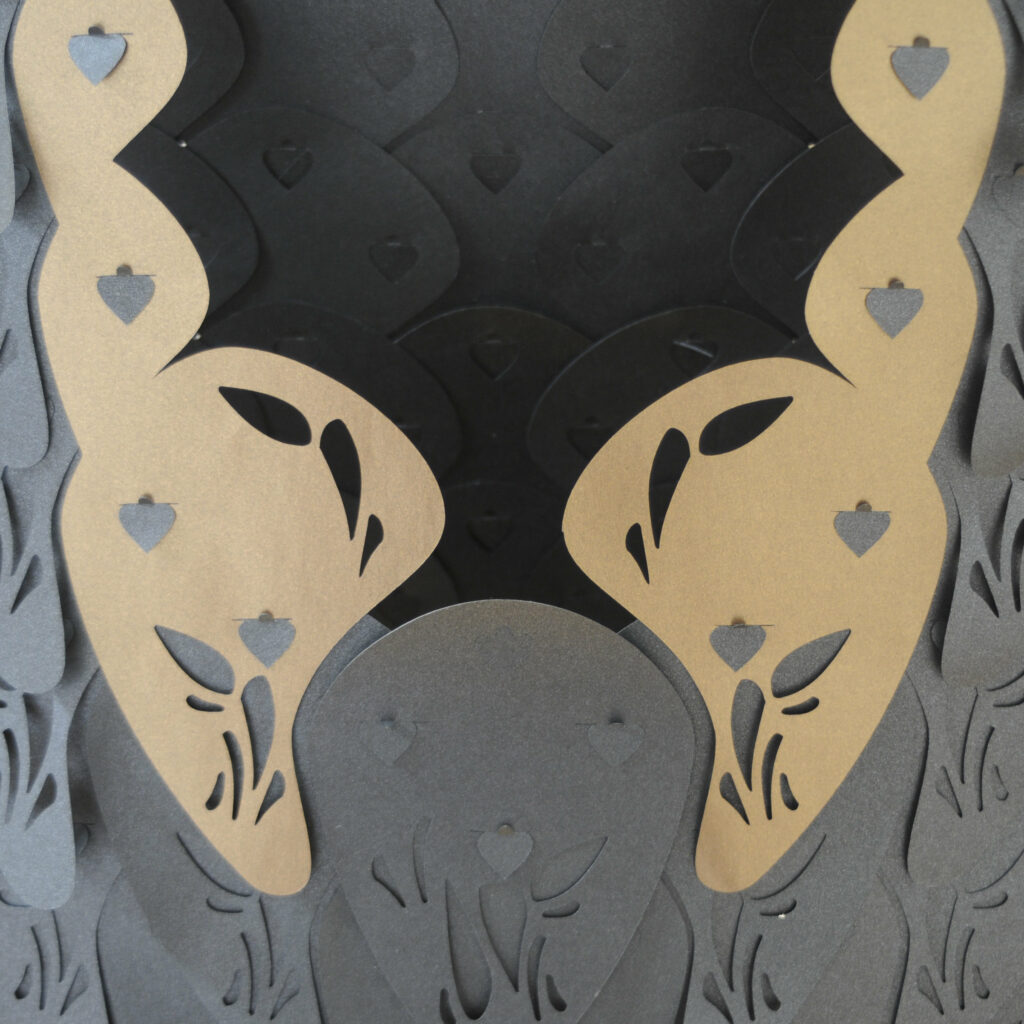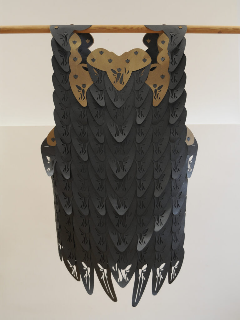 D’inspiration « Art Deco » c’est une robe 100 % papier, 0 % de quoi que ce soit d’autre ! Pas de colle, ni de fil : absolument que du papier muni d’entailles. 178 pièces assemblées, chacune par un minimum de 4 accroches en forme de cœur « Korkarto ».