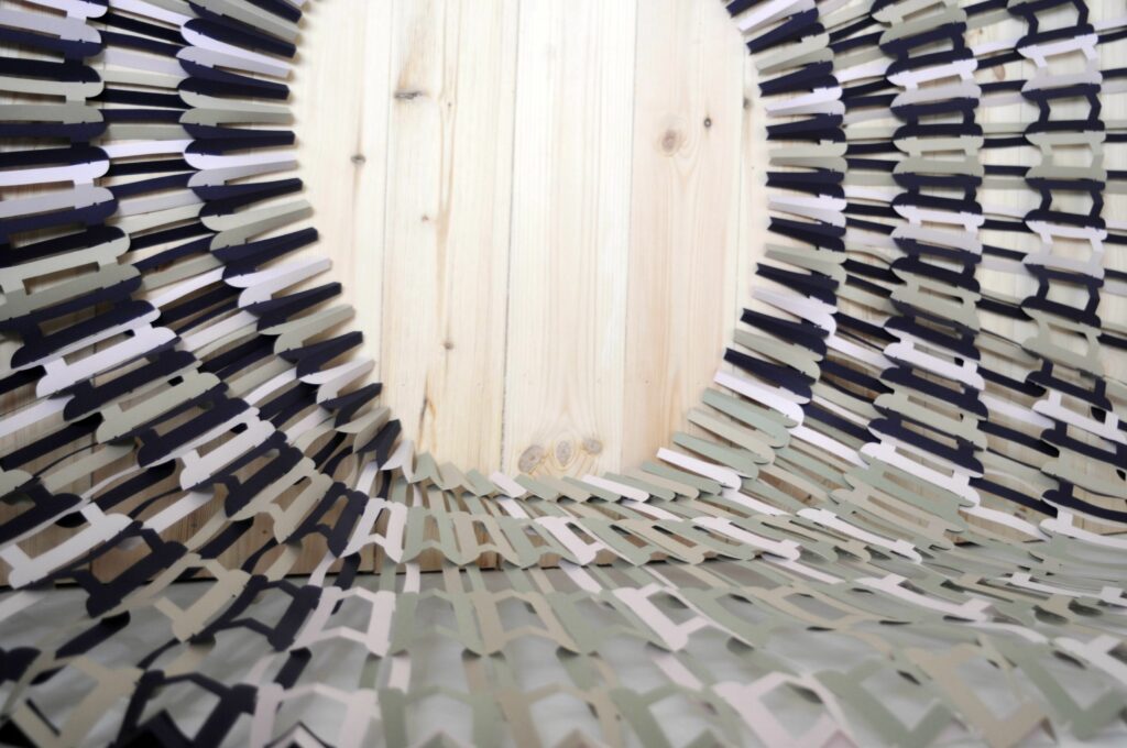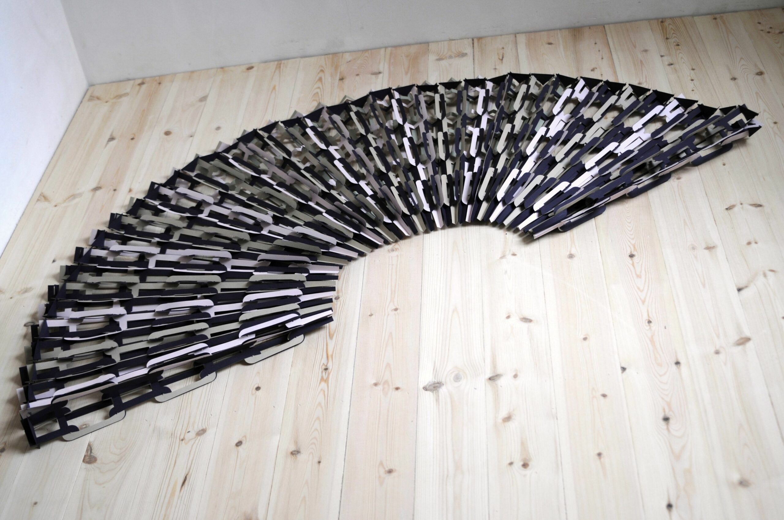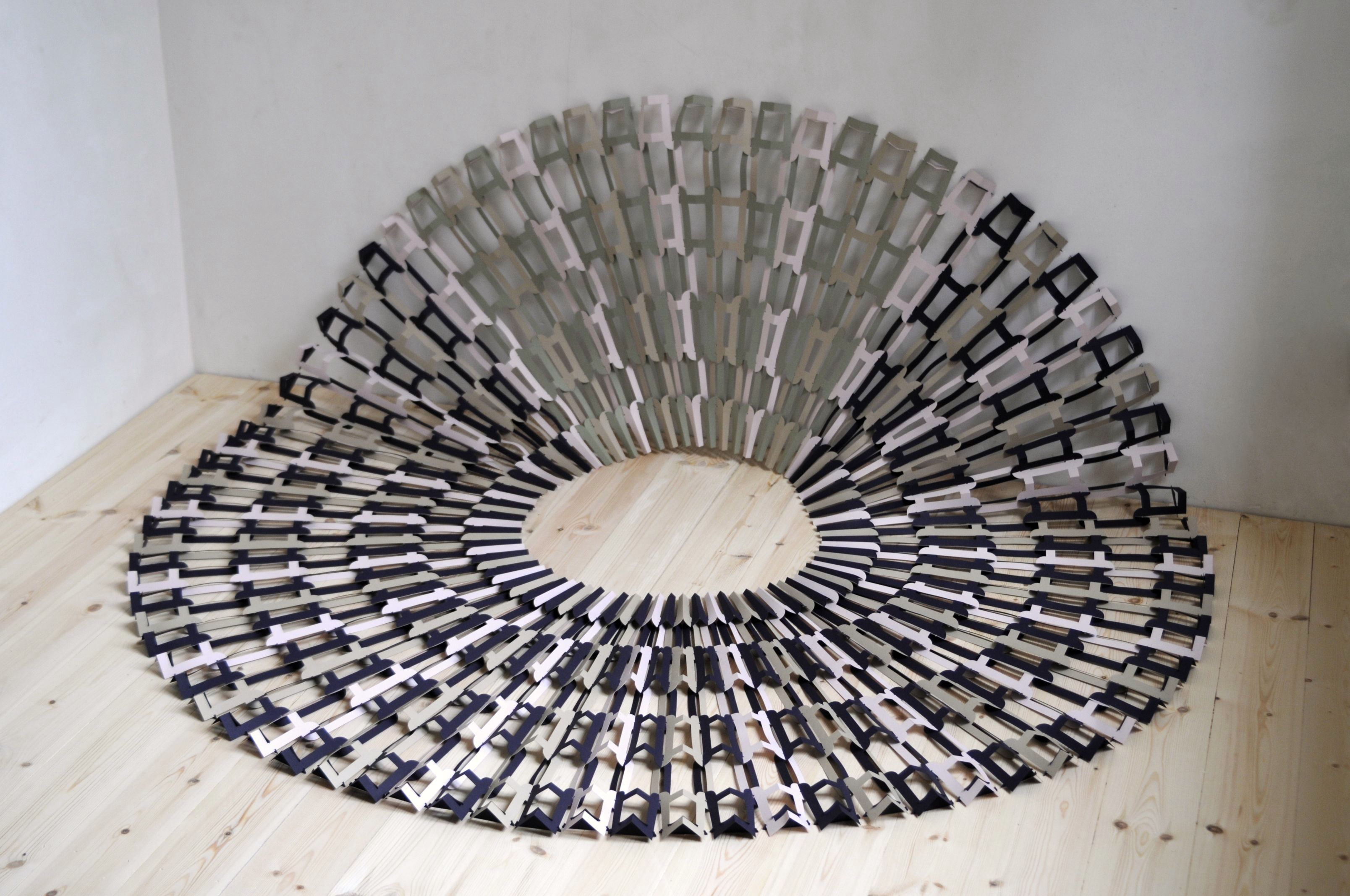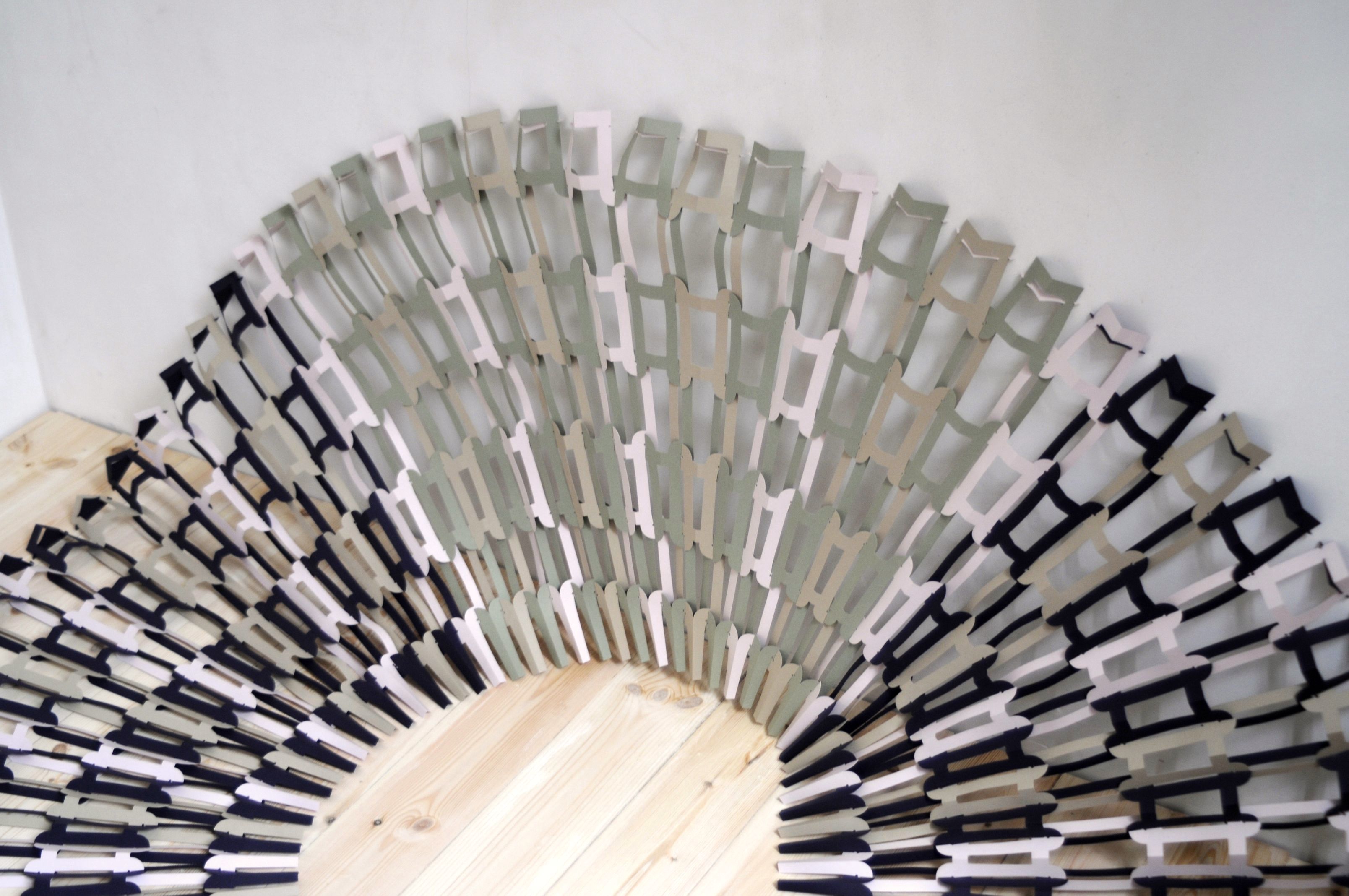 Sans mots pour ce cercle, qui reste jusqu’à présent ma création favorite. Sur les photos, on peut voir une partie verte et rose qui a aujourd’hui disparu, suite au passage d’une personne distraite qui, lors d’un démontage d’exposition, a marché dessus. J’ai redécoupé les pièces abîmées par cette distraction fortuite. Effectivement, lors de l’exposition suivante au Musée Royal de Mariemont, j’ai choisi de l’exposer sans cette partie abîmée, estimant qu’elle ne perdait pas en force. L’avant-dernière photo montre les derniers moments de l’intégrité de cette œuvre et la dernière image montre son exposition à Mariemont sans la partie abîmée.