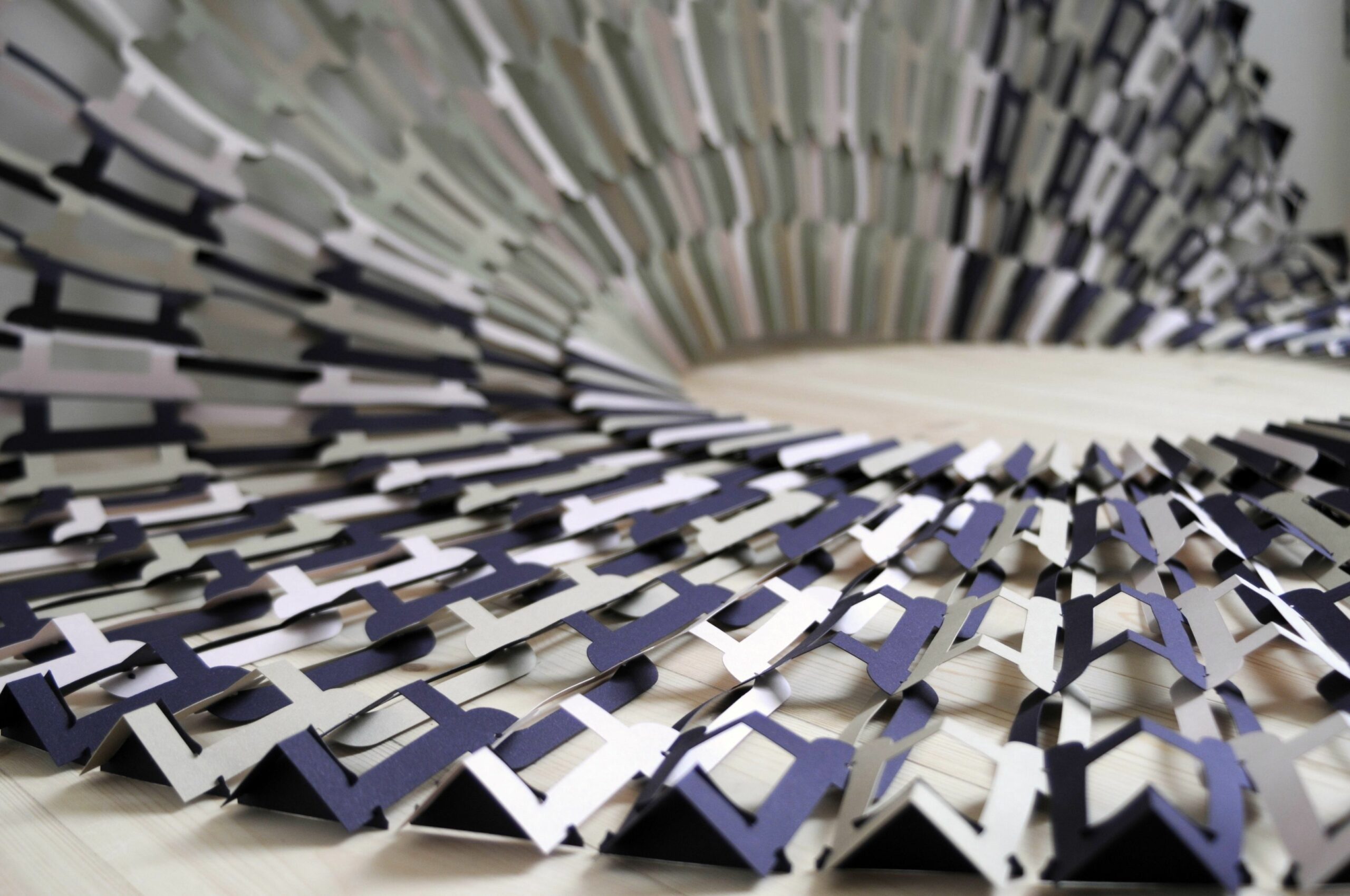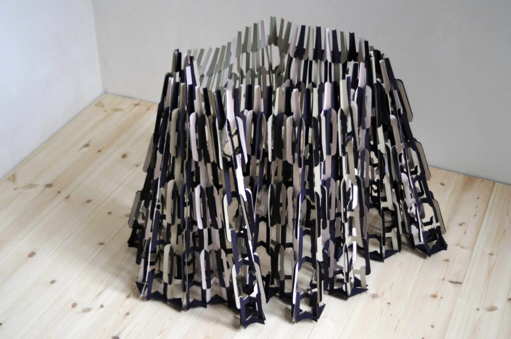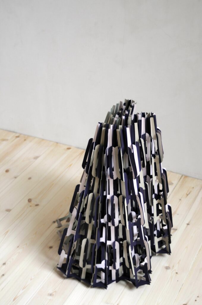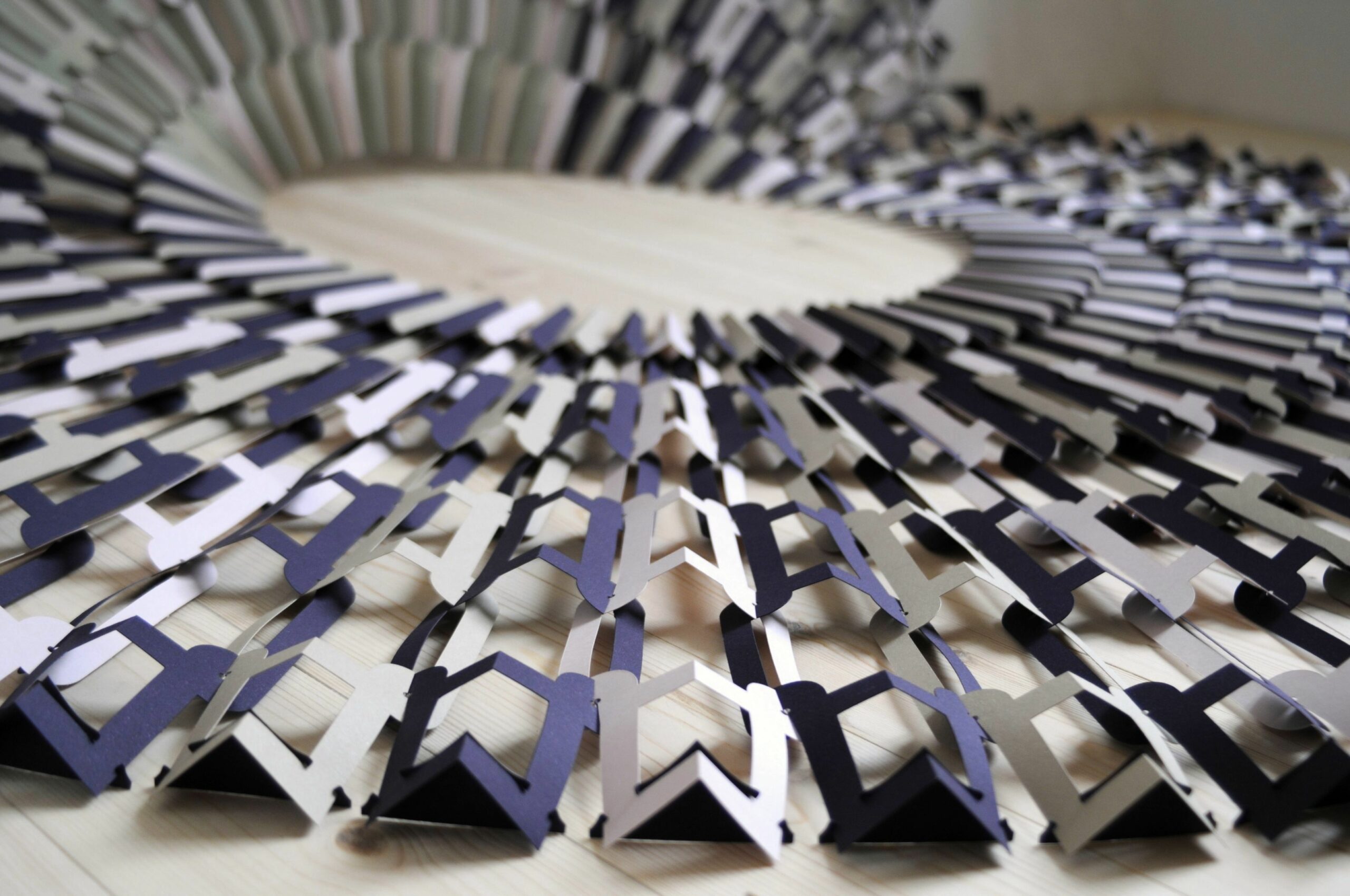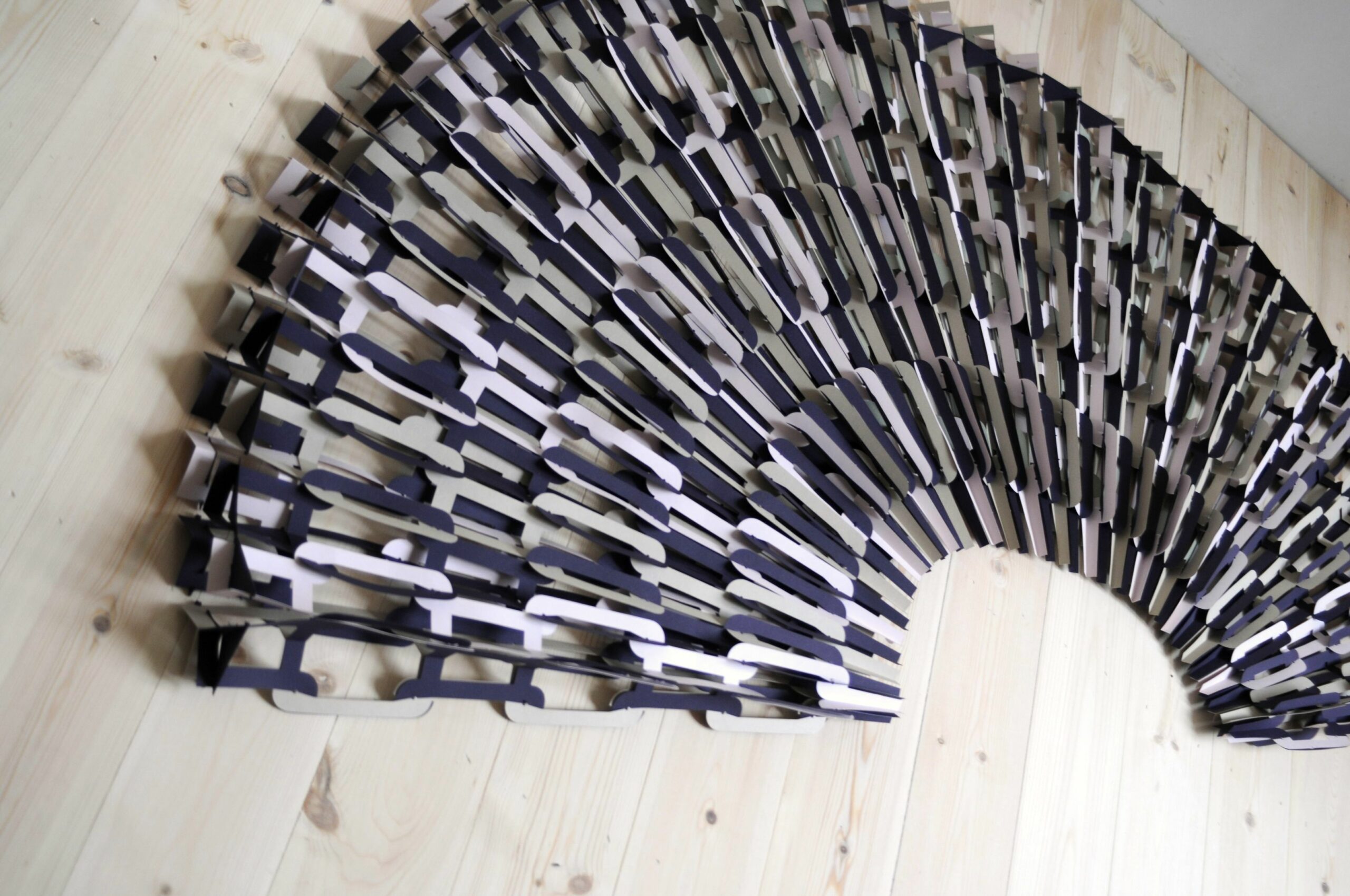 Sans mots pour ce cercle, qui reste jusqu’à présent ma création favorite. Sur les photos, on peut voir une partie verte et rose qui a aujourd’hui disparu, suite au passage d’une personne distraite qui, lors d’un démontage d’exposition, a marché dessus. J’ai redécoupé les pièces abîmées par cette distraction fortuite. Effectivement, lors de l’exposition suivante au Musée Royal de Mariemont, j’ai choisi de l’exposer sans cette partie abîmée, estimant qu’elle ne perdait pas en force. L’avant-dernière photo montre les derniers moments de l’intégrité de cette œuvre et la dernière image montre son exposition à Mariemont sans la partie abîmée.