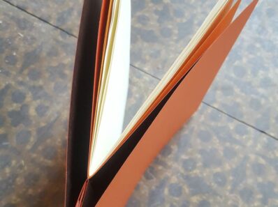 Reliure à Cahier unique sur un onglet de comblage, avec décors « Dots » voir l’article : Dots by Tokowo. Cette reliure permet une bonne ouverture du cahier tout en le préservant d’un collage. Ce type de reliure est idéal pour préserver un cahier unique tout en le gardant consultable et à l’abri de l’usure.