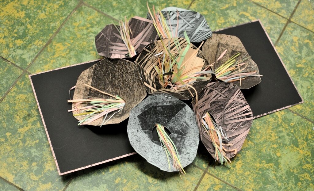 Reliure à Cahier unique sur un onglet de comblage, avec décors « Dots » voir l’article : Dots by Tokowo. Cette reliure permet une bonne ouverture du cahier tout en le préservant d’un collage. Ce type de reliure est idéal pour préserver un cahier unique tout en le gardant consultable et à l’abri de l’usure.