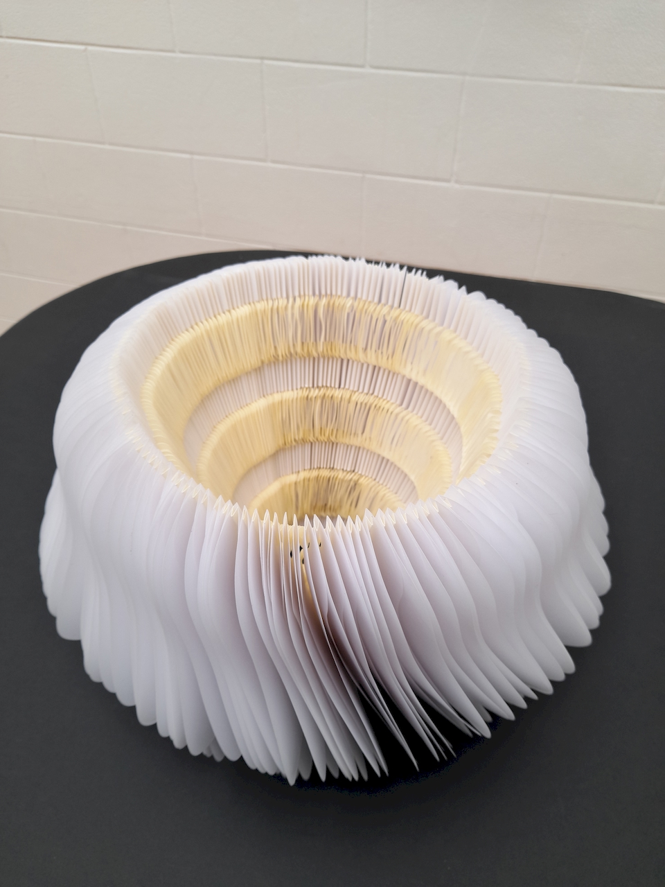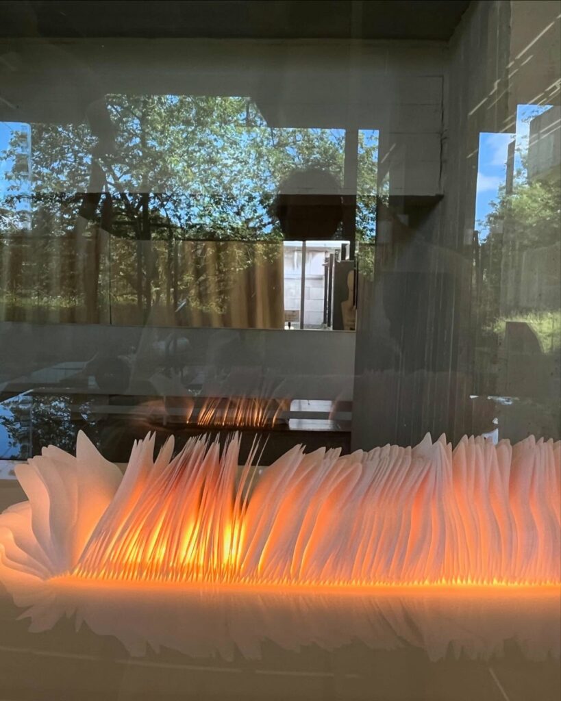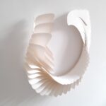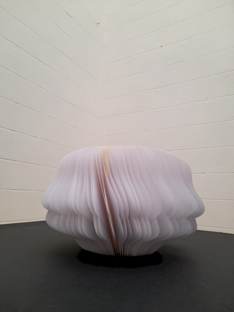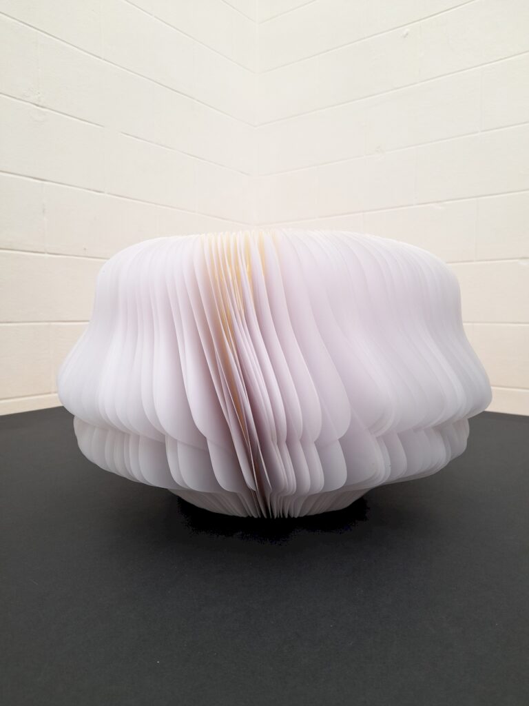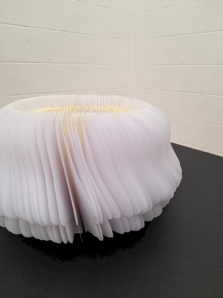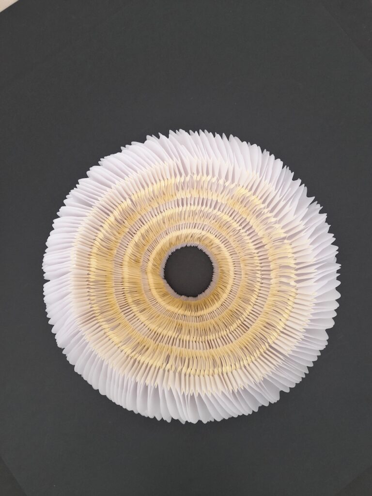 Au départ, je comptais créer une œuvre tout en longueur, telle qu’elle a été exposée au Musée Royal de Mariemont l’été 2024… En fin de compte, ce sera l’infini d’un cercle, un livre blanc infini aux pages courbées et asymétriques se rapprochant d’un vase, d’un contenant à un autre. Le flux des mots disparus permettra d’abreuver une plante imaginaire.