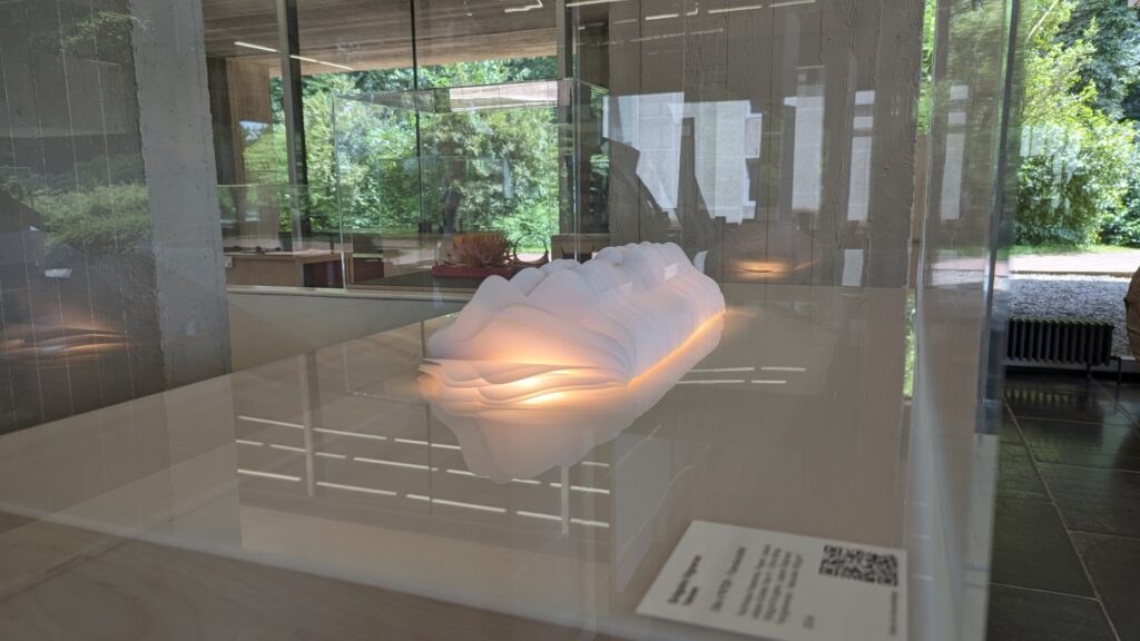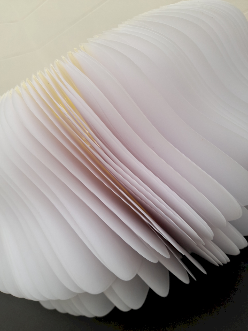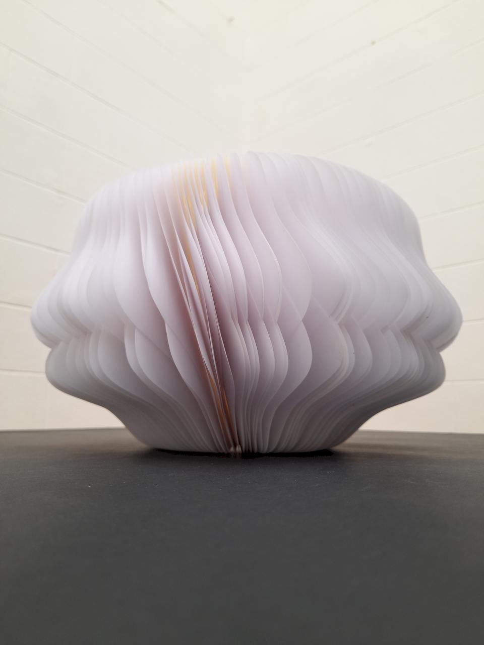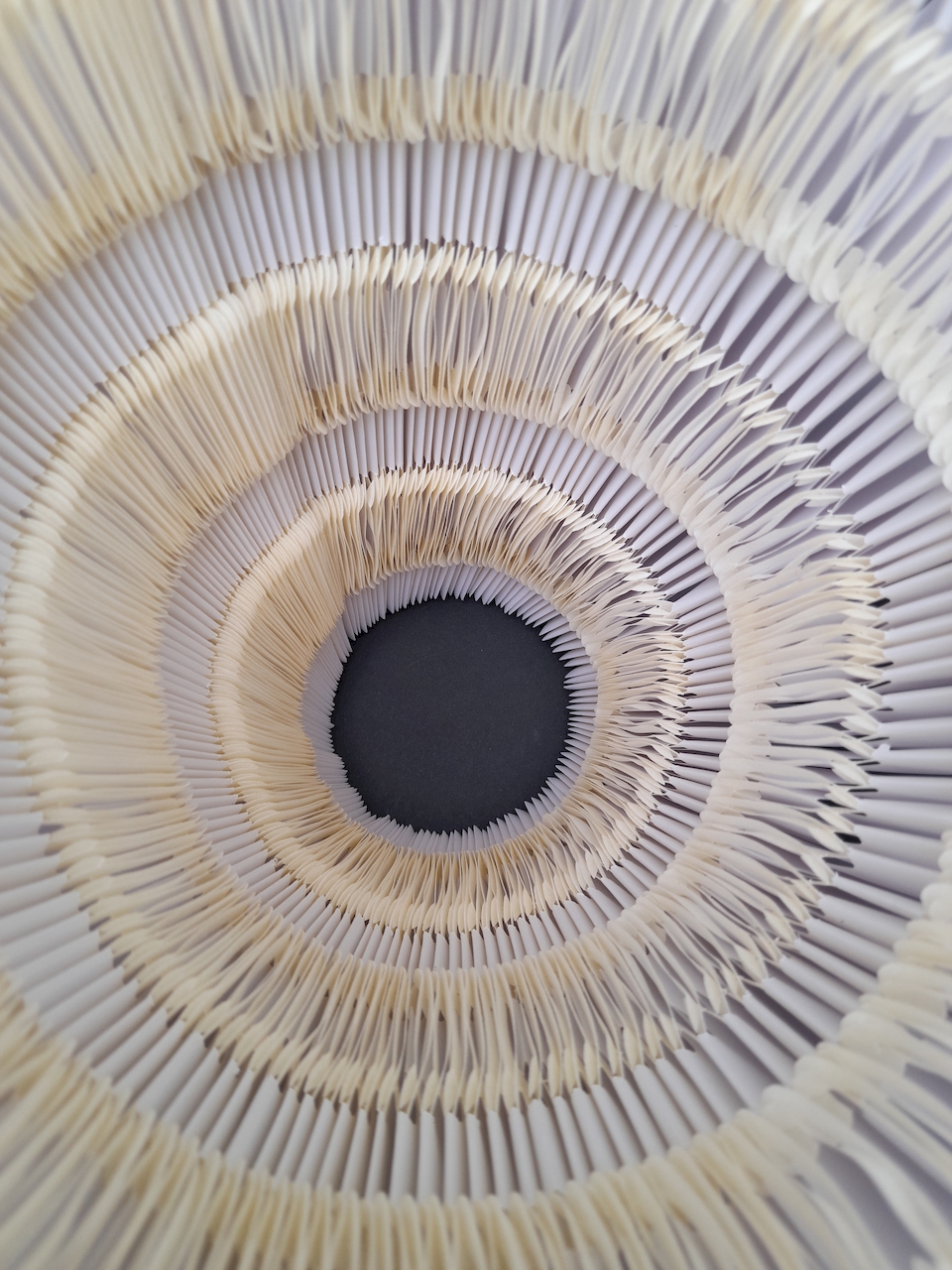 Au départ, je comptais créer une œuvre tout en longueur, telle qu’elle a été exposée au Musée Royal de Mariemont l’été 2024… En fin de compte, ce sera l’infini d’un cercle, un livre blanc infini aux pages courbées et asymétriques se rapprochant d’un vase, d’un contenant à un autre. Le flux des mots disparus permettra d’abreuver une plante imaginaire.